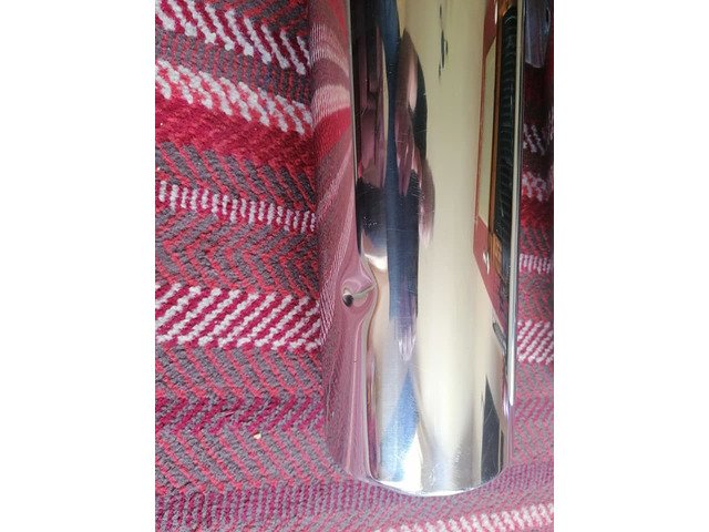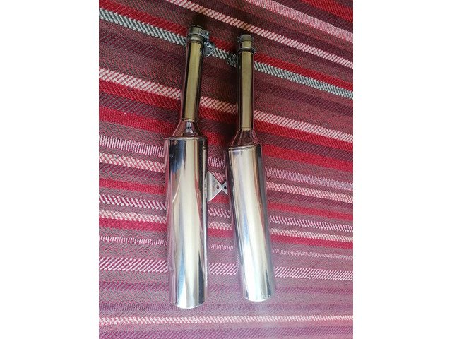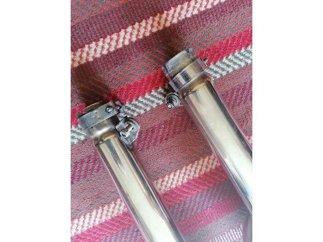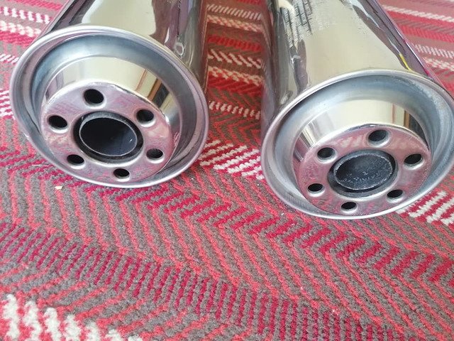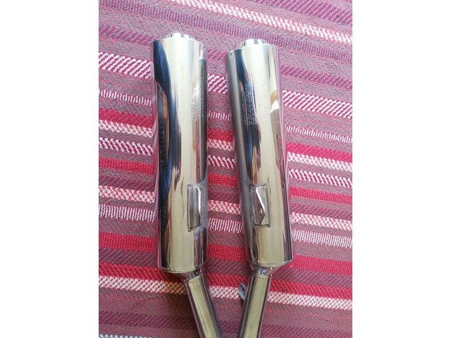 Exhausts complete with clamps, one small dent below one of the cans £100.