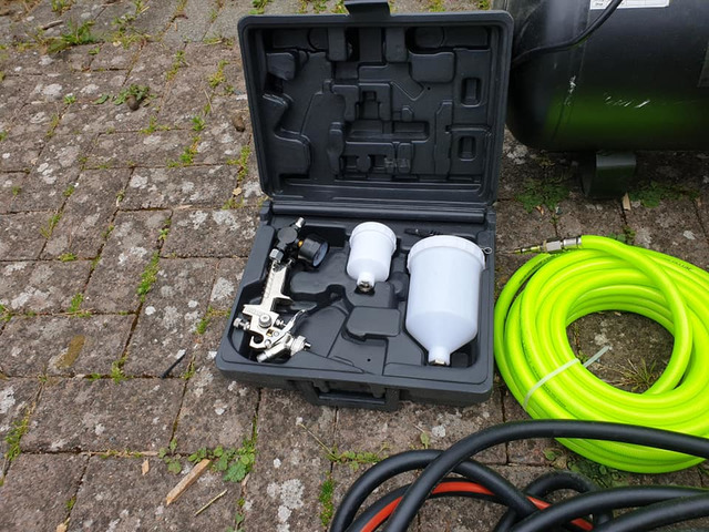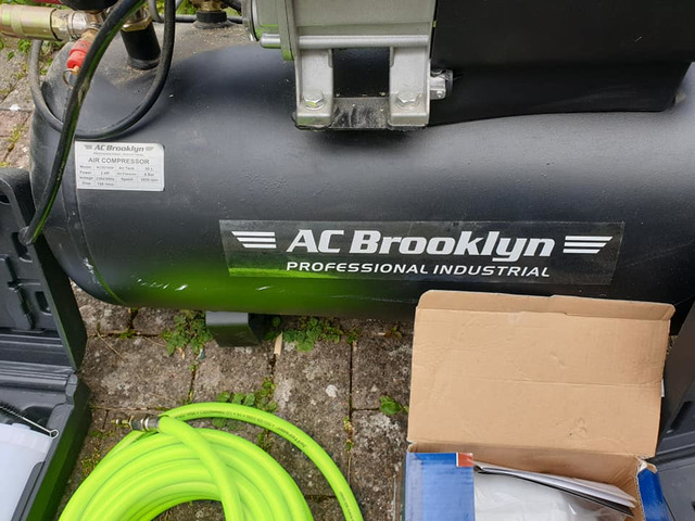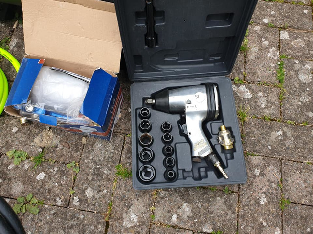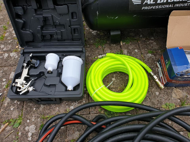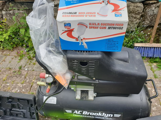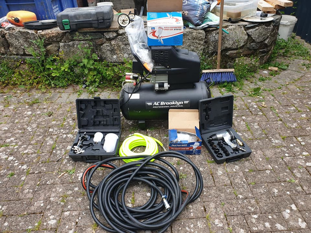 Compressor brand new never used aswell as hoses spraye guns brand new and socket gun