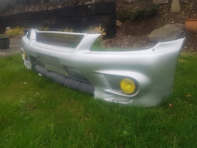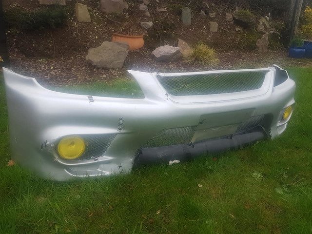 fibreglass bumper with fogs, patched with cable ties, would suit drift car or field car/scut bus
