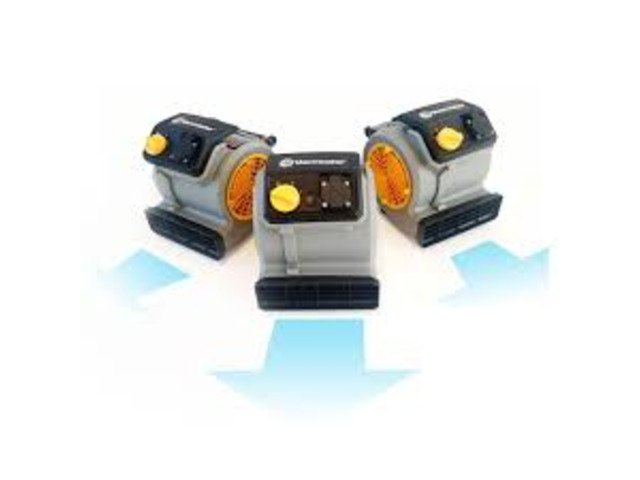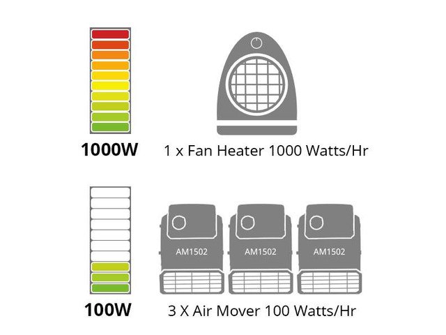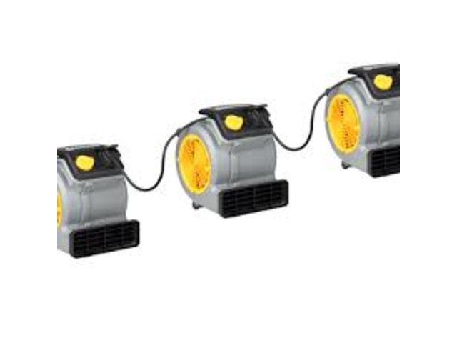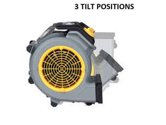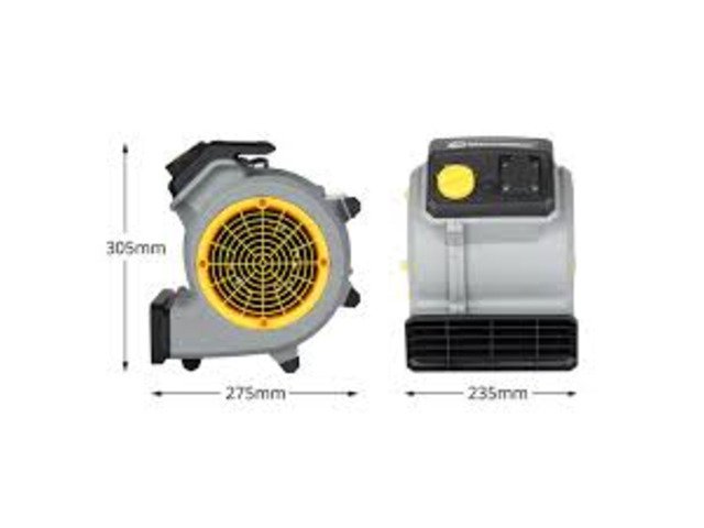 Compact energy efficient Air Mover for rapid drying of carpets, upholstery, plaster, concrete, paint, car seats etc, this machine has 3 air flow settings, and 3 tilt positions, 3.7m cable, and integrated extension socket to add more air movers together for larger areas, each machine drives 266 litres of ambient air per second. This machine is very energy efficient consumes 90% less power than a conventional 1000w fan heater. 240v. 150w. 1300 Rpm