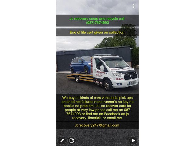 We buy all kinds of cars vans 4x4s pick ups crashed nct failures none runner's no key no book's no problem I all so recover cars for people at very low prices call me on 087 7674993 or find me on Facebook as jc recovery limerick or email me on [email protected]