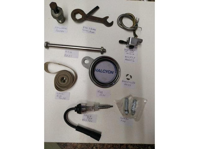 NSU FLYWHEEL PULLERS. SPARKPLUG SPANNER WITH FEELER GAUGE ATTACHED..NSU MODEL L HEADLAMP ON AND OFF SWITCH...NSU AXEL..TAX DISC HOLDER ..WHEEL RIM TAPE ..THREE NSU WOODRUFF KEYS..SPARKPLUG TESTER..TWO NSU COTTER PINS .