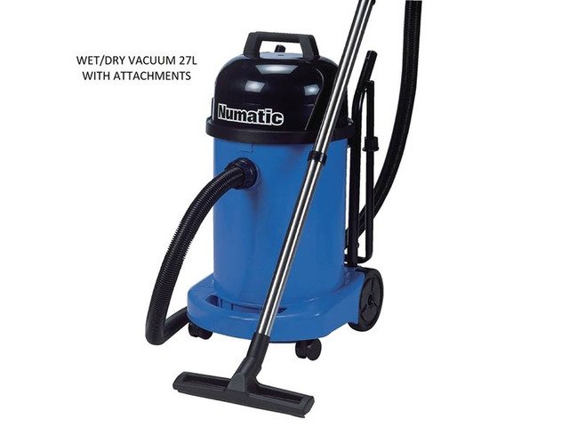 Numatic wet/dry 27L vacuum this machine is on a trolley comes with all attachments for we/dry pickup plus white head for car seats great machine for contract cleaners etc. This machine is NEW with warranty comes in 220v and 110v. Numatic top brand very reliable