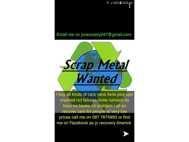 I buy all kinds of cars vans 4x4s pick ups crashed nct failures none runner's no key no book's no problem I all so recover cars for people at very low prices call me on 087 7674993 or find me on Facebook as jc recovery limerick or email me on [email protected]