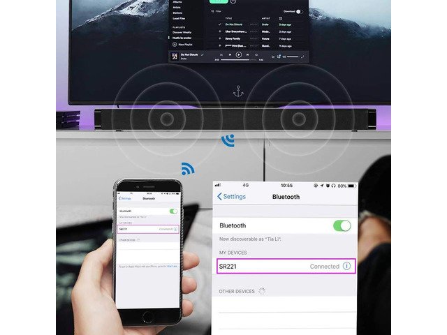 The sound bar can be placed directly on the TV stand or mounted to the accompanying wall to reduce clutter and save space. No matter how you choose to place it, rich clear sound will reach all around the room for an incredible home-theater experience. 1. Plug the DC power on the wall. 2. When you plugged in AUX-IN port at the back of Soundbar, use remote to switch mode into AUX Mode. The same step as Bluetooth connections. Easily link your sound bar with your tv for better sound.