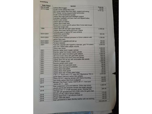 1999 Ducati 996 BP, Immaculate bike with way to many extras to list, comes with all original paper work including original sales invoice, owners manual, PDI sheet, both keys with datatool etc, 7000 miles, starts first turn and runs perfectly, over the years has had £22,000 worth of extras fitted, spec breakdown is in the pictures, previous owner had it on display in his house, bike is located in N.Ireland but I can deliver to mainland UK for a small fee, this is not an old race bike that's been tidied up its an immaculate road bike and a good investment as they will only go up in value, for more info call 07784717247 anytime £14000 Ono