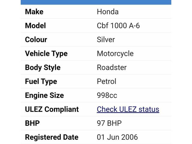 2006 CBF 1000,mot until Oct 21,in nice condition,fully serviced in january including new pads,stator,hand and lens guards, and led light upgrade.The CBF is powered by a 998 cc inline-four engine, which is based on the CBR1000RR Fireblade engine,it has fantastic torque,plenty of power and very frugal with it,with a comfortable 3 postion height adjustable seat and ABS and Hondas reliability make the CBF a fantastic all rounder.Motorcycle news have said;The big Honda CBF1000 is one of the unsung heroes of modern motorcycling. Detuned Blade engine, fabulously easy handling and throttle response and great ergonomics make the Honda CBF1000 hooningly enjoyable, yet novice friendly and a great value all-rounder.Honda top box with fittings and a newly painted bottom fairing (last photo)will come with the bike if the asking price is met.