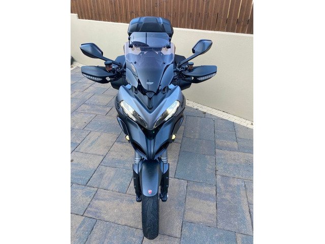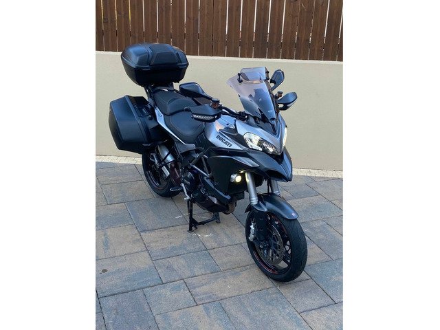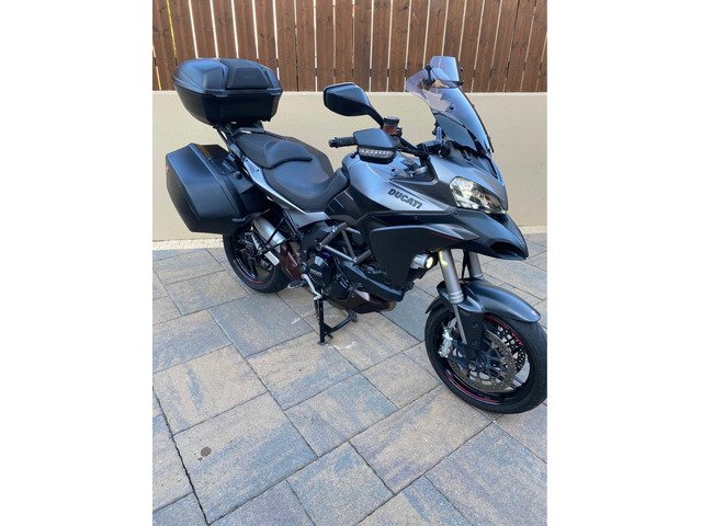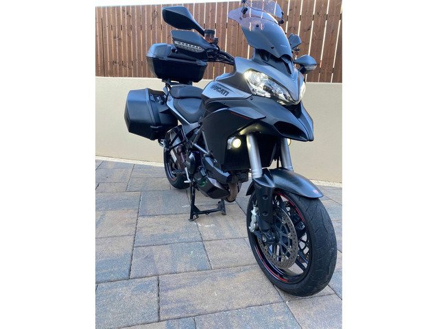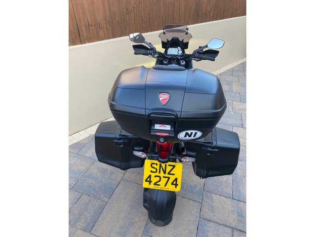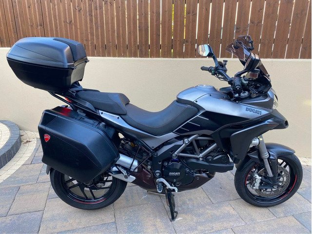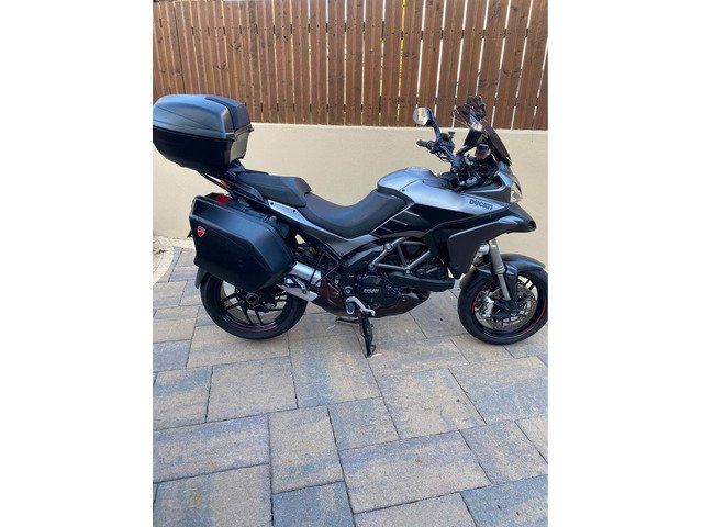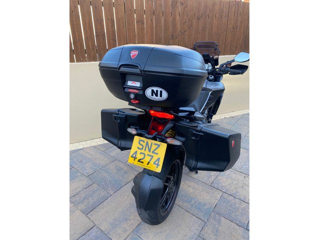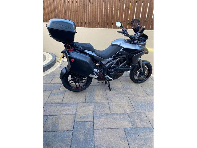 excellent example of the DUCATI MULTISTRADA 1200 S GRANTURISMO 2013 Being the Granturismo model this bike features top box with pillion back rest, panniers , 20mm bar risers, comfort seat, larger screen, spot lights, the unique 'touring grey' with racing grey frame and black wheels ,This year Multistrada also featured the widely loved 'skyhook' suspension, ABS, traction control, centre stand, heated grips and much more. This really is all the bike you will ever need. Kitted perfectly for touring when fully loaded and when all the bags are stripped off you have a thin, nimble bike that thanks to the 1198cc v twin motor derived from Ducatis previous superbike, you have a bike that is more than capable at upsetting a lot of superbikes. V5, owners manual, and is HPI clear.