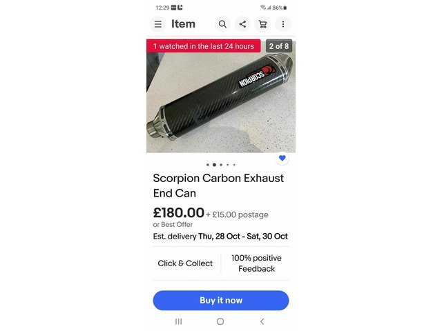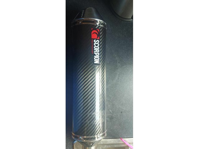 Carbon fibre Scorpion Exhaust few marks from hanging bracket showen in pictures no dents no good condition apart from that probably compound out if you were bothered same one on ebay 180 or best offer plus 15 postage I'll take £100 if anyone Interested can post at buyers cost