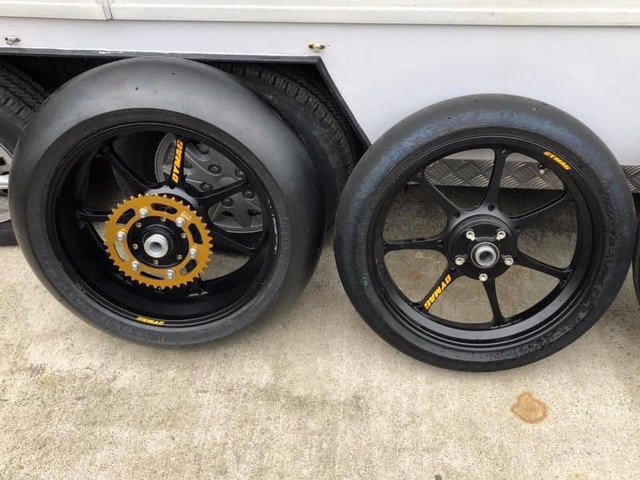 Brand new dymags rear has never been fitted , front has done about 5 laps of brands the white mark on rear Dymag is grease from fitting £1600