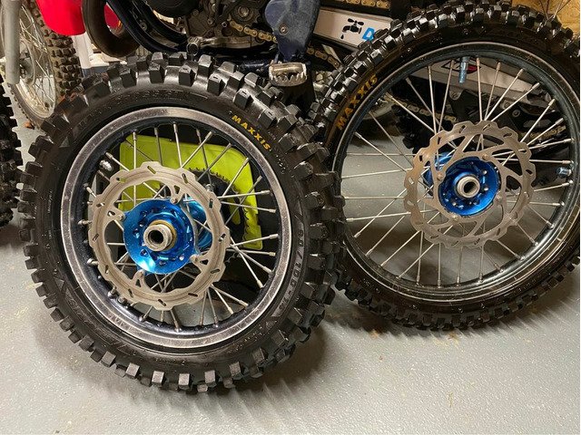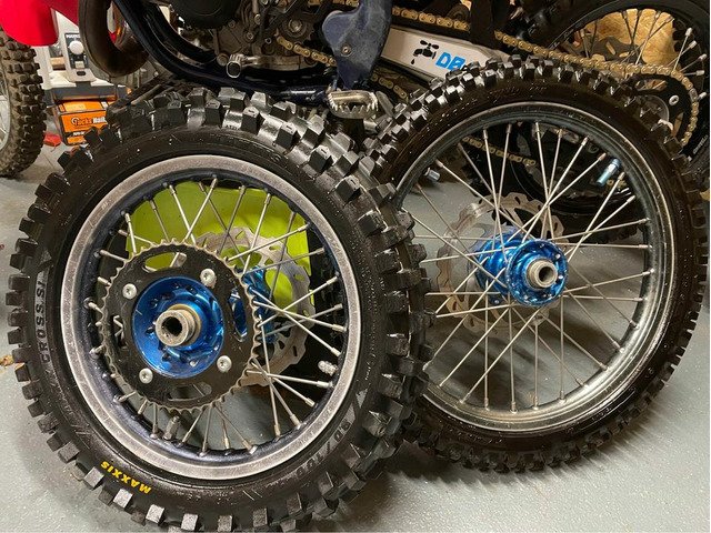Sx Tc 85 Excel rims with blue talon hubs small wheels 2018 will fit up to 2022 over sized rear disc to fit 21/22 bikes rims no buckles, new bearings done 2hrs Come with sprocket disc’s and tyres Everything