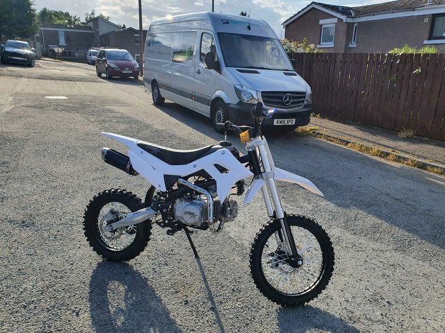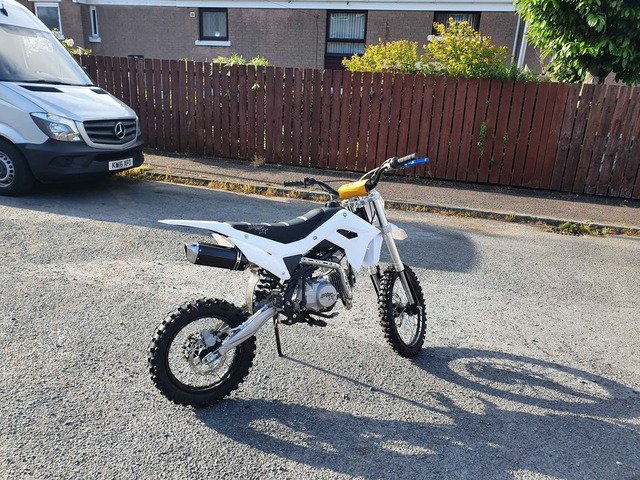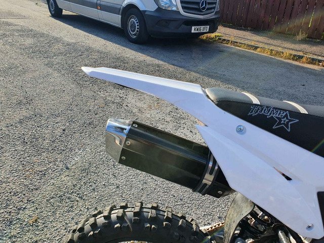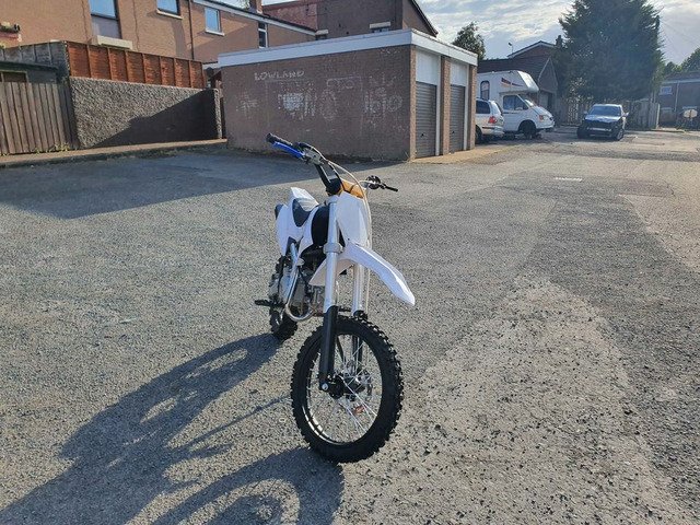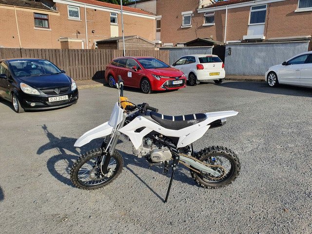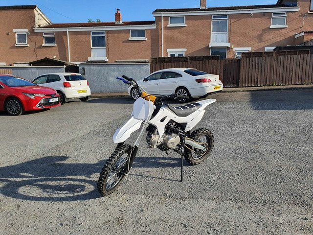 Bought it brand new for £1300 less than 3 weeks ago. Barley used, done less than one tank of fuel. It's a 2021 Thumpstar 140 (took the stickers off it). Has new adjustable front brake and clutch levers. Only selling to afford new car. No silly offers. Very good and fast bike. Working mechanically 100%, starts first kick. Comes with new medium size helmet, medium size gloves, polarized goggles, bike cover and heavy duty chain + lock. Can send video of starting first kick and running.