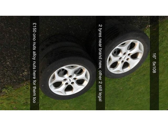 16" 5 Y spoke snowflake alloys. 5x108 came off a focus. 2 near new tyres 2 legal. Alloy nuts here for them.