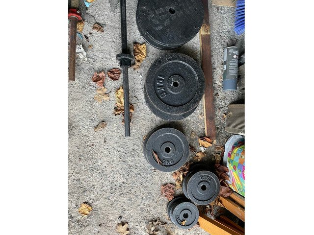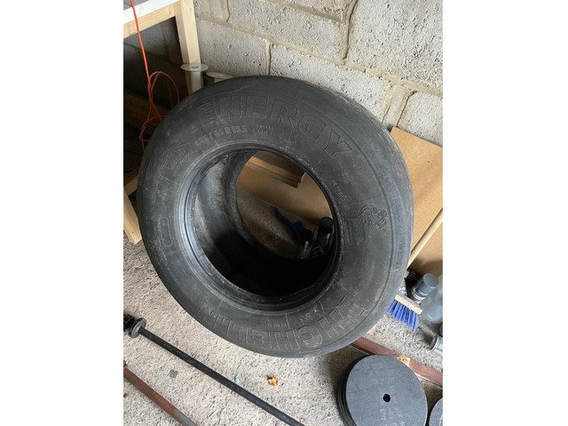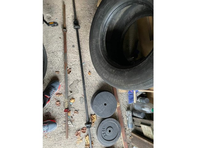 Barbell + weights + tyre for training