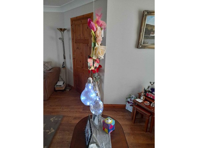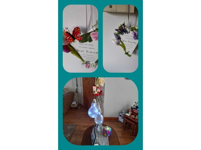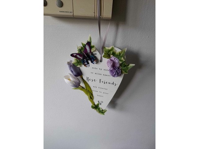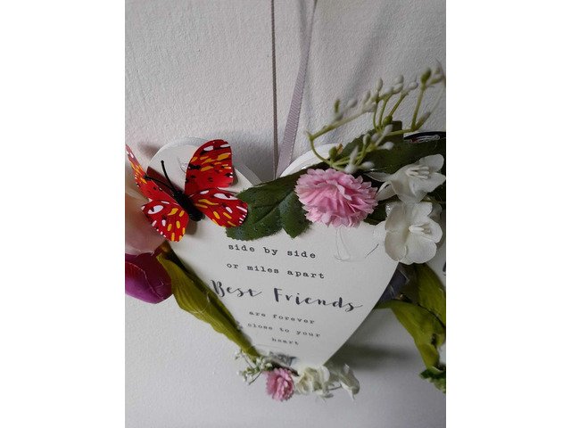 Best friends plagues with purple or pink flowers and hanging lights great for your patio umberellas