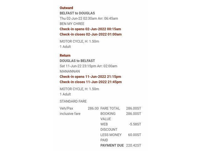 Return ferry ticket for TT 2022. Deposit paid, balance due end of February.