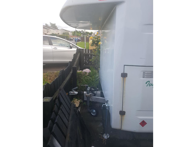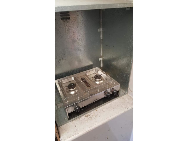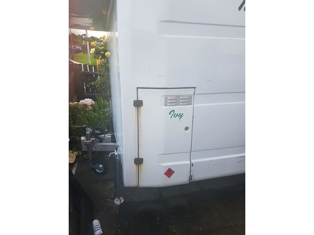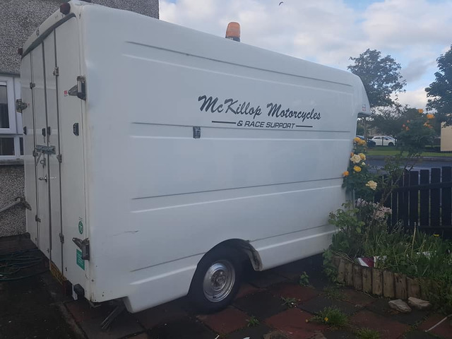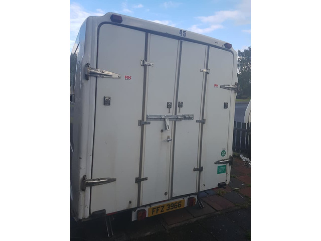 Bt box mounted on caravan chasis 10'6×7' 2 ring hob, locking doors with keys, 2 new tyres, 12 volt lighting, sky light, new tail board easily towed excellent for bikes or kart or market trader bag a bargain. Phone or text 07999390257 john. Inside all cleared out.