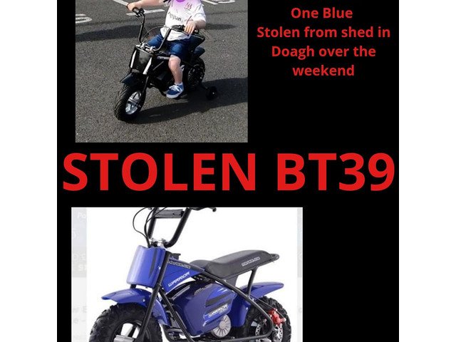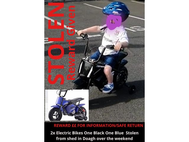 Cash reward for wareabouts of these 2 electric bikes. One black one blue