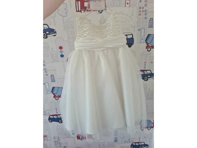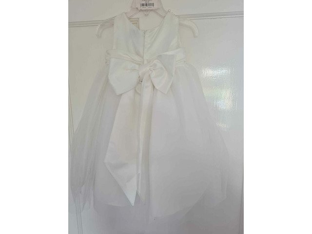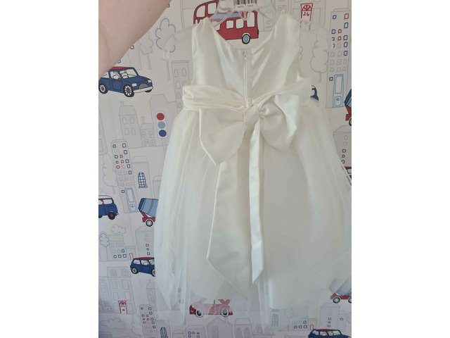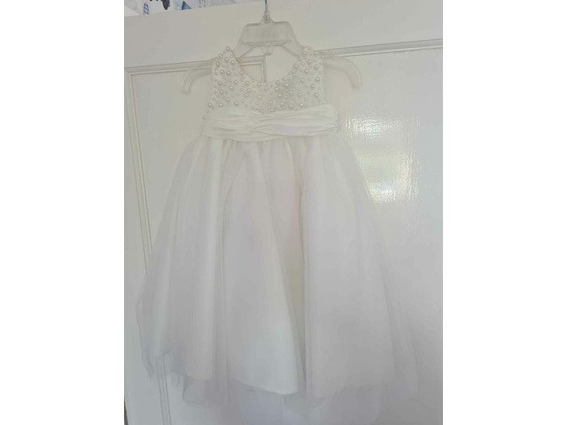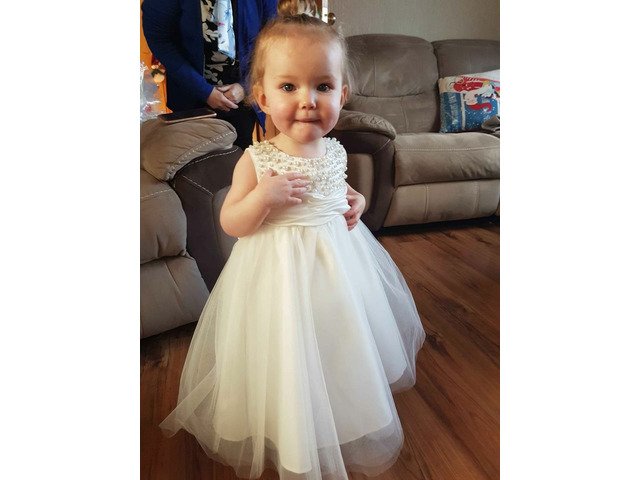 Brand new (only ever tired on once to see what it was like) flowergirl dress aged 6months however it is big fitting i would say 9-12/12-18 (my daughter was just shy of being 2 at our original wedding date)