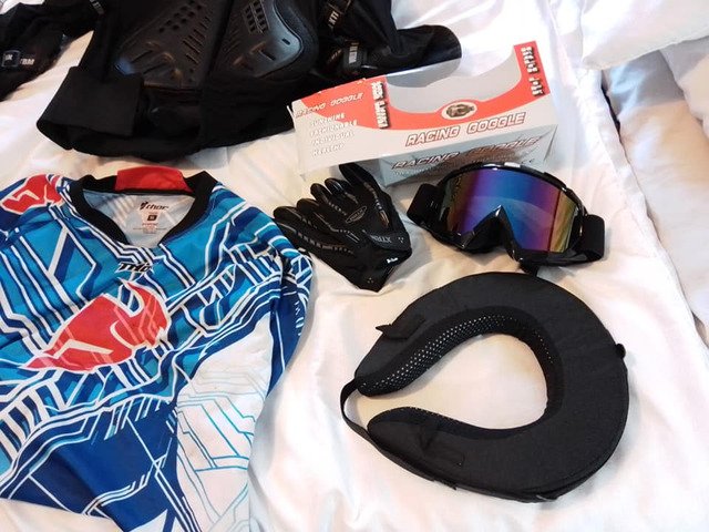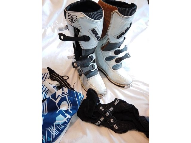 Helmet kids large brand new.. gloves goggles neck brace brand new . Body armour . Top amd bottoms kids large. Boots size 5 these last few items used but great condition would fit 11/14 year old