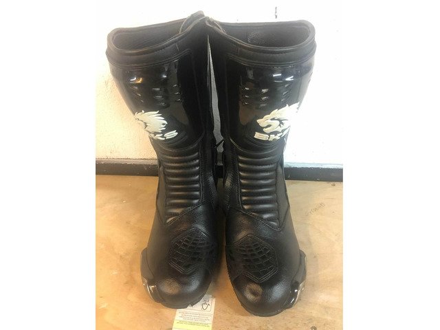 Pair of men’s BKS Motorcycle boots size euro 44 which equates to 91/2 not a 10 as claimed as my toes can confirm. These boots have been only worn once since purchase and are fault free, beautiful boots just too tight for me.