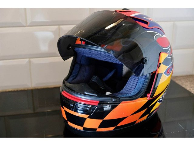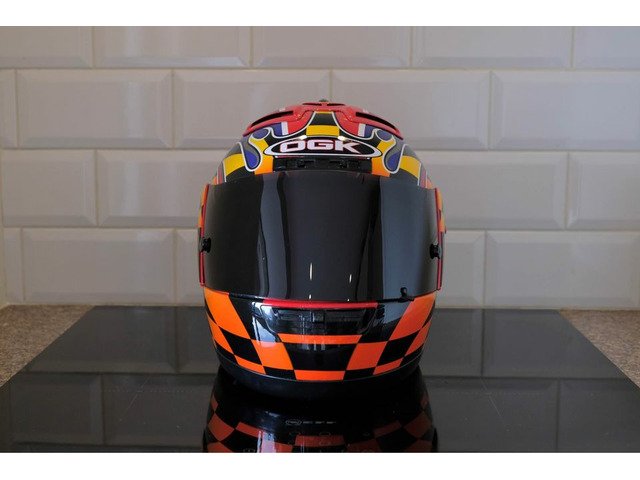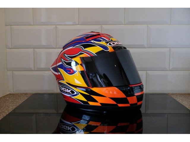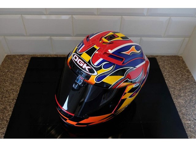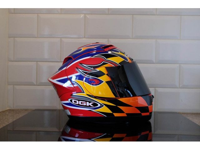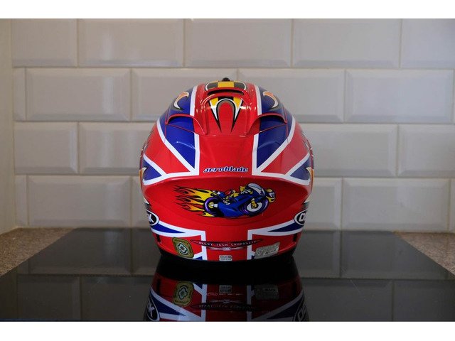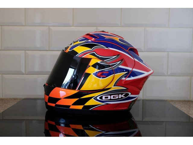Rare OGK Aeroblade David Jefferies helmet. The helmet itself was manufactured 10/08/2002 and is in good used condition. Comes with dark tint visor and OGK helmet bag. I would not recommend this for use on the road due to its age but these are becoming increasingly rare these days and this would make an ideal addition to any collection or simply just the road racing enthusiast who wants a piece of motorcycling memorabilia!
