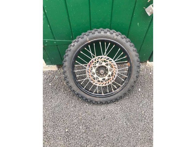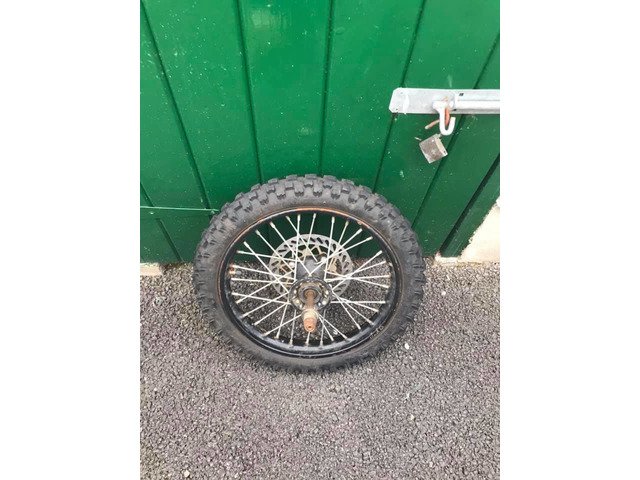 Front pitbike wheel 14” in good condition no broken spokes and tyre has plenty of life left still comes with disc and axles and spacers could do with a bit of a clean up if fussy.