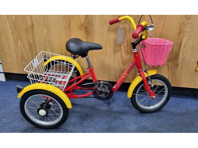 The Mission Musketeer is a 14" wheel trike for 3 to 5 years approximately