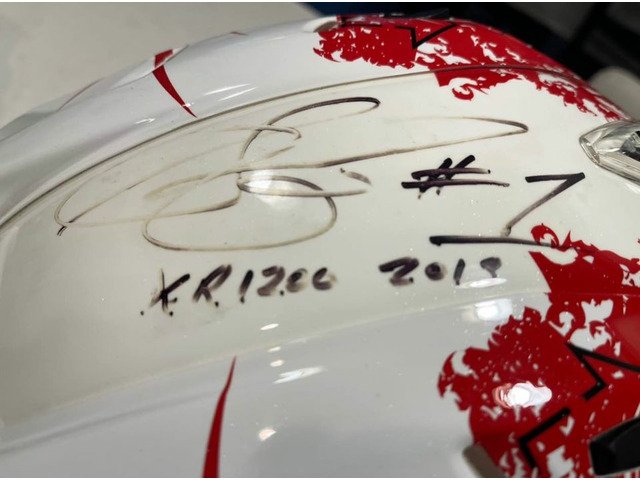 2 Helmets (Arai & HJC) signed & race worn by Steve Crevier (one of the most successful Canadian super bike racers & who was inducted in to the Canadian motorcycle hall of fame) he wore this exact red/wht ARAI helmet in the 2013 Mopar Canadian Superbike Championship -Harley Davidson XR1200 Cup which he won & signed it exactly as that: “XR1200 2013” The pictures show him wearing both these helmets that he’s signed & the suit. These aren’t replicas (they are the exact ones he wore on the day) His custom made one of one Leather “Crevier” race suit is absolutely amazing and was used a lot by him as you can tell by the scars. It’s also signed by Francis Martin (2 time Canadian super bike champion) as well by Steve Hislop, an 11 time TT winner, 2 time BSB champ who passed away in 2003 (British racing bike champion inducted in the sports hall of fame)
