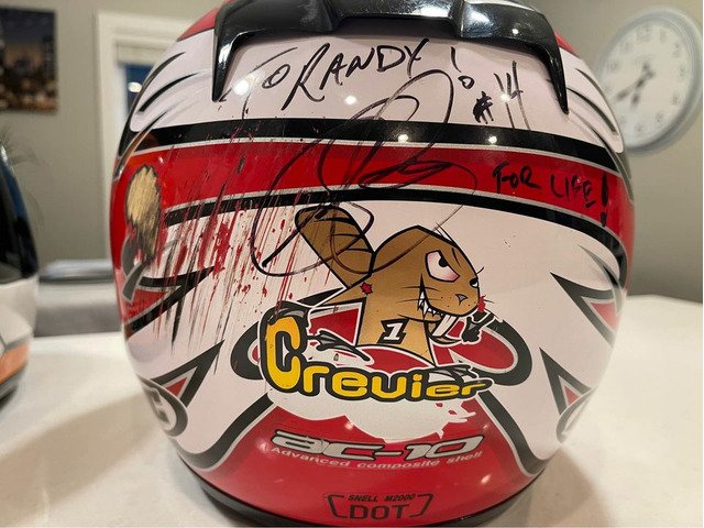 2 Helmets (Arai & HJC) signed & race worn by Steve Crevier (one of the most successful Canadian super bike racers & who was inducted in to the Canadian motorcycle hall of fame) he wore this exact red/wht ARAI helmet in the 2013 Mopar Canadian Superbike Championship -Harley Davidson XR1200 Cup which he won & signed it exactly as that: “XR1200 2013” The pictures show him wearing both these helmets that he’s signed & the suit. These aren’t replicas (they are the exact ones he wore on the day) His custom made one of one Leather “Crevier” race suit is absolutely amazing and was used a lot by him as you can tell by the scars. It’s also signed by Francis Martin (2 time Canadian super bike champion) as well by Steve Hislop, an 11 time TT winner, 2 time BSB champ who passed away in 2003 (British racing bike champion inducted in the sports hall of fame)