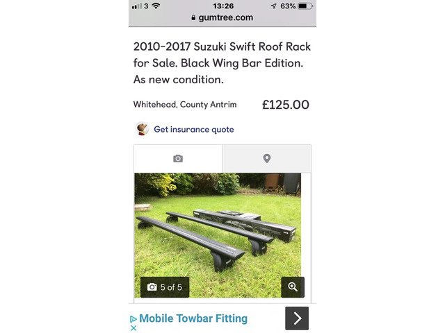 2010 to 2017 Suzuki Swift Roof Rack. Black Wing Bar Edition. As new. Advertised on Gumtree.