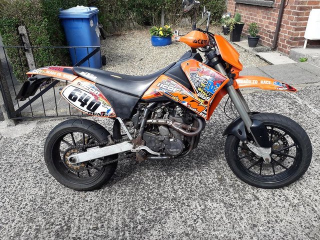 1999 KTM 640. Was the last of the Duke 1s. Has Duke 2 wheels fitted. SM plastics. Kelvin carb trailtech digital dash. MOTed last week and recently serviced One very fit bike despite its rough appearance on close inspection. Could do with a seat cover and a proper clean. No test pilots,test run can be taken when cash is present.