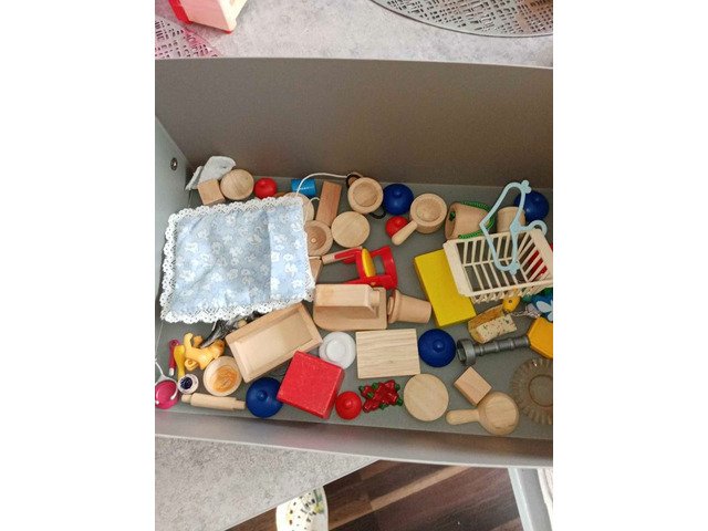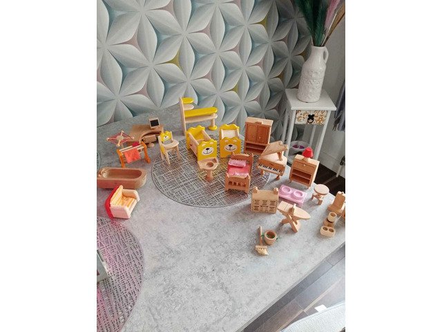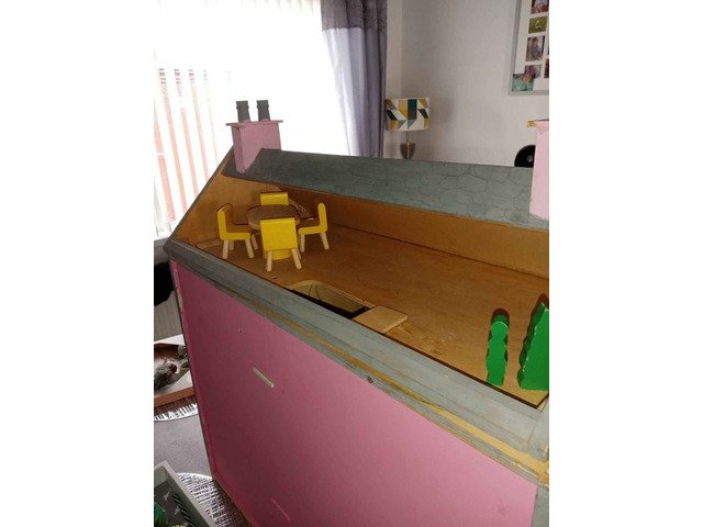Wooden dolls house with open at front and roof lifts off to play at top, furniture comes with it and other wee bits and pieces