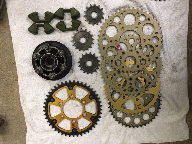 zx6r/zx10r sprockets, carrier and rubbers. sprockets are 14, 16 x 2, 41, 43, 45, 46, and 47, also have carrier and rubbers. fronts £5, rears £15, carrier and rubbers £40.
